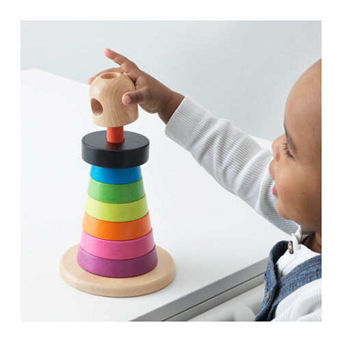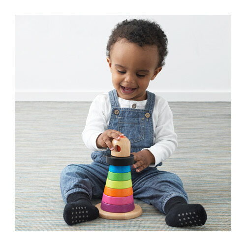 【IKEAイケア】MULA だるま落とし スタッキングリング, マルチカラー, ビーチ 商品の大きさ 直径: 13 cm 高さ: 20 cm 製品の特徴 - 柔らかい棒にリングを通して重ねて遊ぶうちに、色や形を学びます - お子さまの運動能力や論理的思考力の発達を促します デザイナー Francis Cayouette パッケージの大きさと重さ 商品番号: 302.948.88 パッケージ数:1 長さ: 21 cm 直径: 14 cm 重さ: 0.63 kg お役立ち情報 対象年齢:12カ月以上 セット内容:柔らかい棒が付いた木製ベース1つ、リング7個、てっぺんに乗せるつまみ1個 お取り扱い上の注意 湿らせた布で水拭きしてください 素材 木製パーツ: ビーチ無垢材, ステイン, 透明アクリルラッカー ゴム部分: 合成ゴム